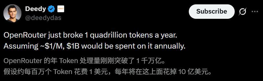 OpenRouter告示,年化Token用量破裂了一千万亿。