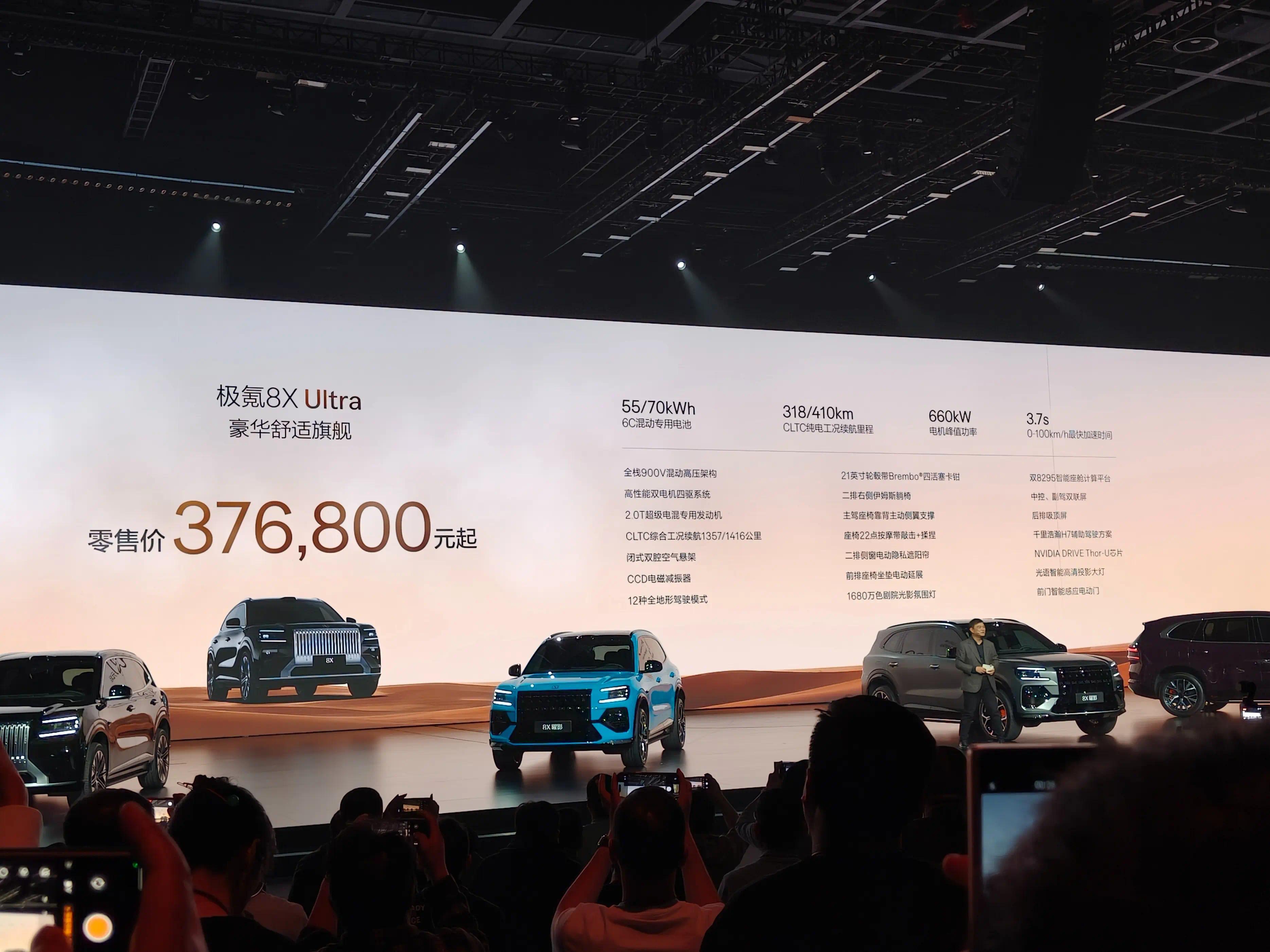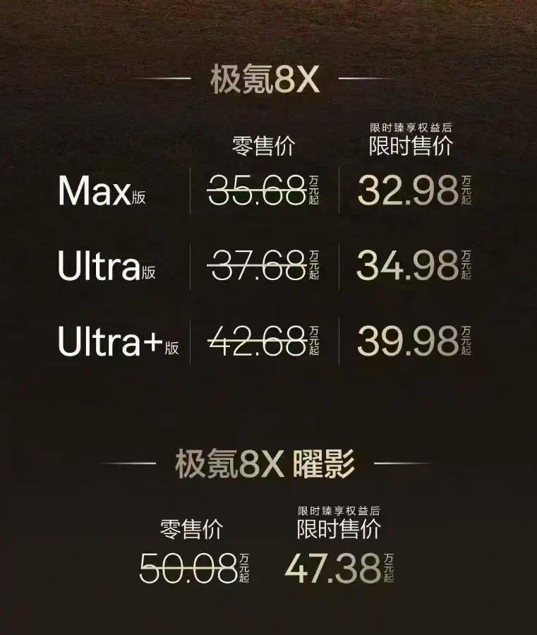 极氪8X订价公布那一刻,现场爆发出一阵欣喜。新车共推出Max、Ultra、Ultra+三个版型,官方零卖价永别为35.68万、37.68万和42.68万;职权后限时售价32.98万、34.98万、39.98万,全系打入40万以内。此外,手脚高性能版块的极氪8X曜影版同步上市,职权后限时售价47.38万。