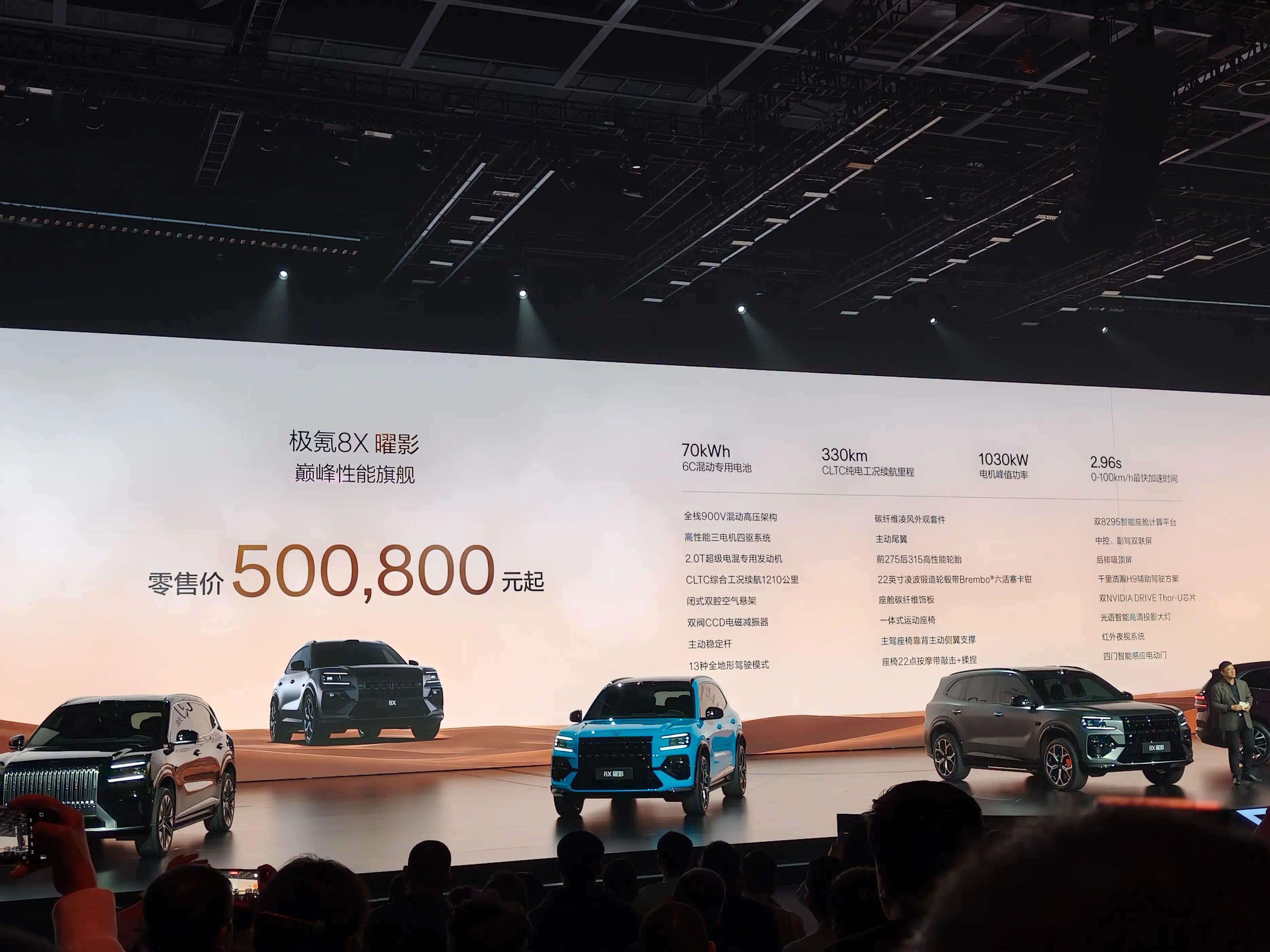 至于极氪8X曜影版,除了更激进的外不雅套件、黑橙专属内饰、碳纤维套件以及同级独一主动尾翼外,还搭载三电机,最大马力超千匹,合营同级独一315宽胎,零百加快2.96秒,性能更强,但这个价钱已不错计议极氪9X了。