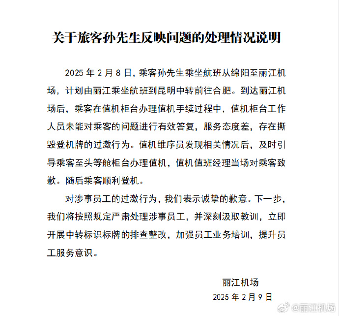 2月9日晚九游会体育,@丽江机场 发布对于游客孙先生反馈问题的处置情况讲明。