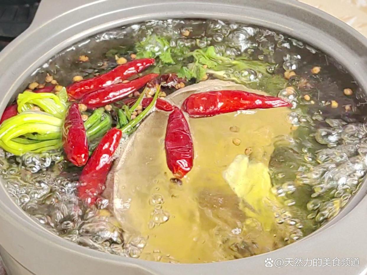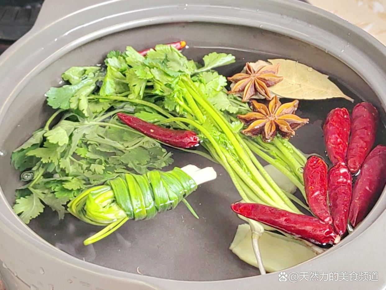 3、砂锅中加水,水的量要以能没过猪肝为圭臬,加入2个八角,1小块桂皮,3片香叶,3克花椒,20克生姜,8个干辣椒,3根小葱,3棵带根的香菜,开大火炬水烧开,水开后再煮10分钟,咱们要先把香料的香味先煮出来。