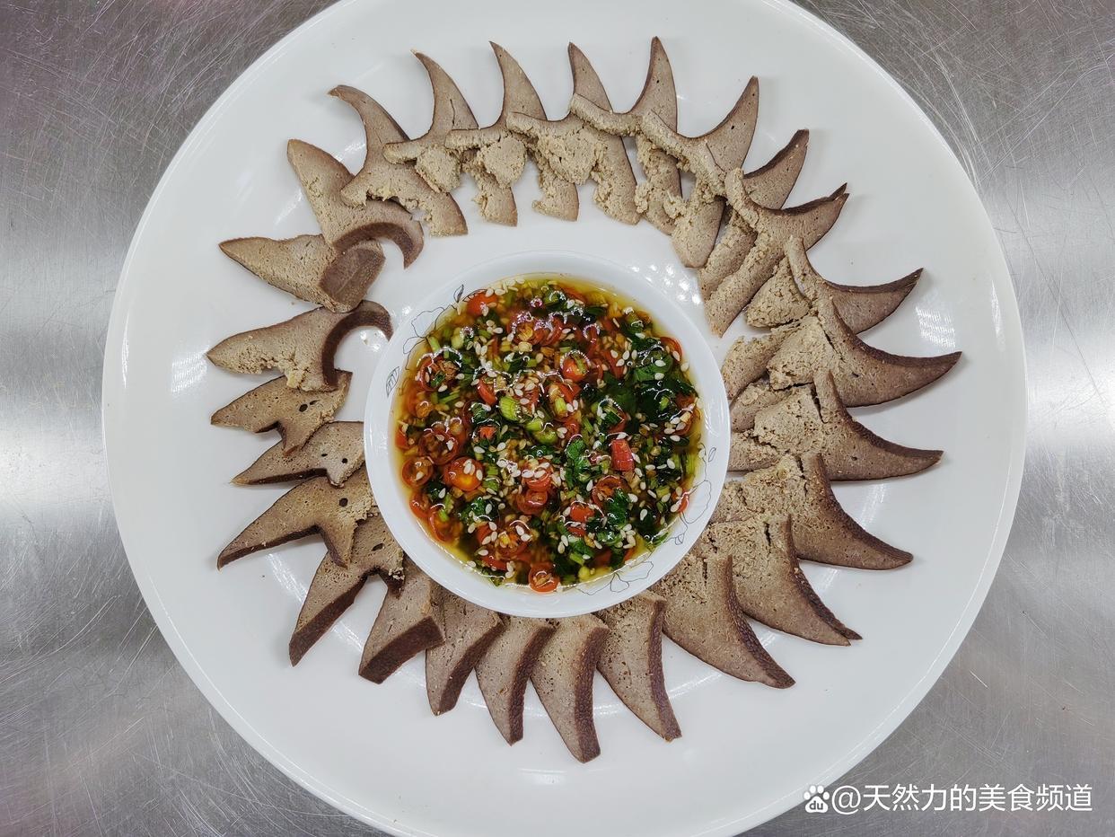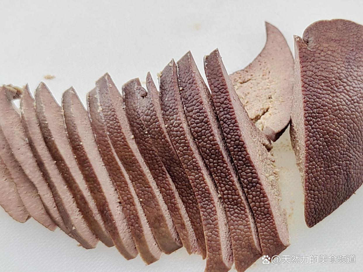 6、猪肝焖了1个小时后就不错捞出,然后顶刀切成比硬币更厚一些的片,淌若切太薄了会莫得嚼劲,切好后再摆一个我方心爱的造型,不错上菜了,厚味即成。