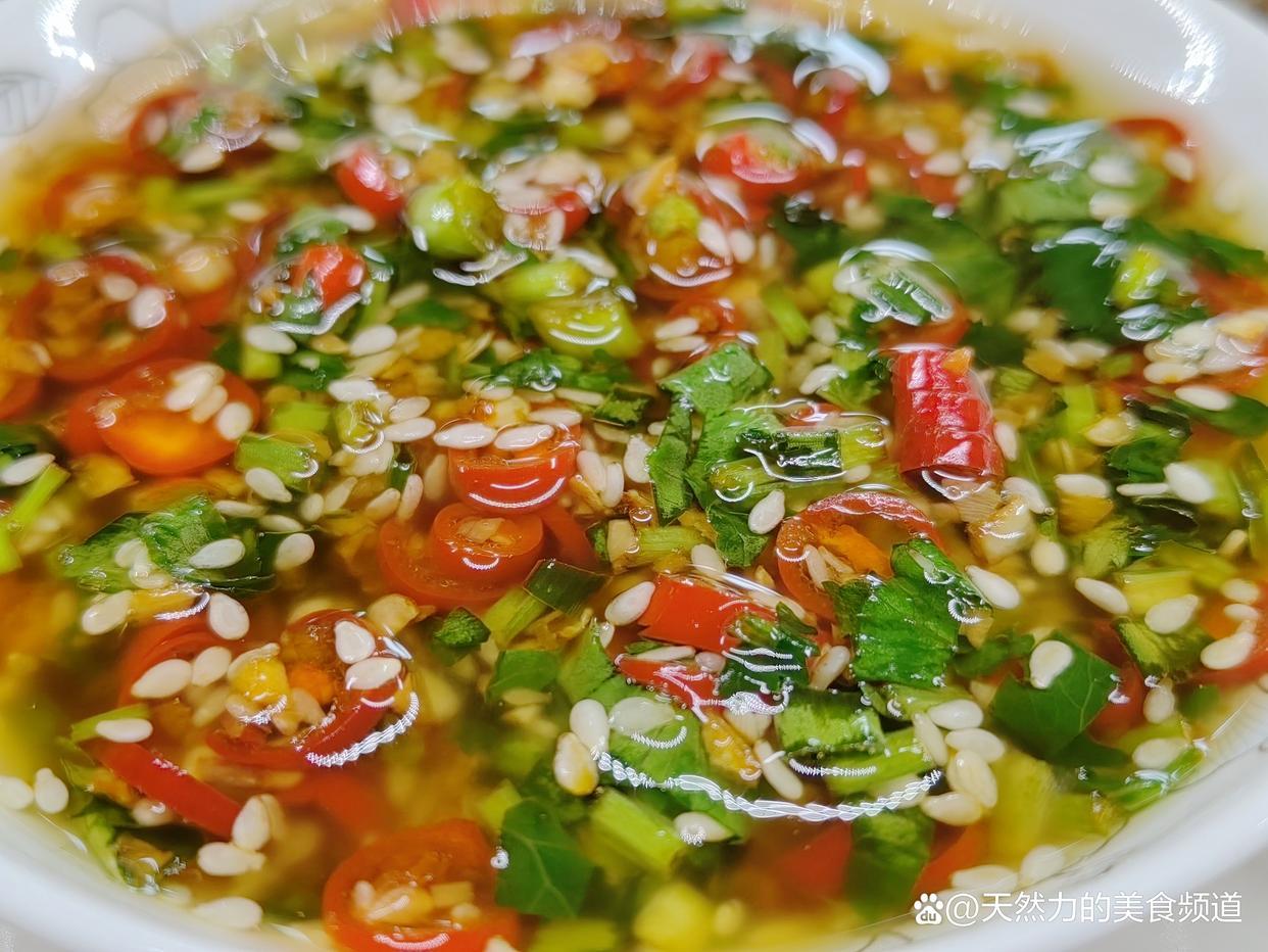 5、在焖猪肝的时候咱们来准备一个灵魂蘸料,盘中加入10克蒜蓉,18克小米椒圈,5克小葱葱花,10克香菜碎,5克熟白芝麻,淋入30克热油,还要加5克芝麻香油,20克生抽,搅动均匀即可。