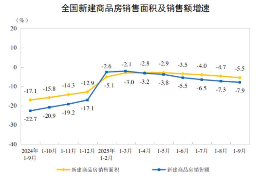 1—9月份,房地产开发企业房屋施工面积648580万宽敞米,同比下落9.4%。其中,住宅施工面积452165万宽敞米,下落9.7%。房屋新开工面积45399万宽敞米,下落18.9%。其中,住宅新开工面积33273万宽敞米,下落18.3%。房屋竣事面积31129万宽敞米,下落15.3%。其中,住宅竣事面积22228万宽敞米,下落17.1%。